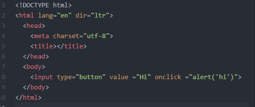 => 버튼이라는 타입을 넣고 그 버튼에 Hi라고 입력을 해라 , 또한 그 버튼을 눌렀을 때 hi라는 경고창이 뜨게 해라