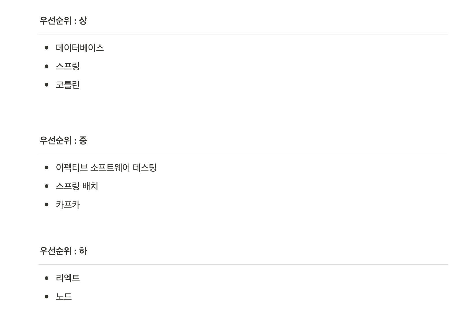 그 후, 현재 주어진 환경에서 내가 어떤 학습이 제일 필요할지에대해 스스로에게 질문을 던졌고 이를 기반으로 우선순위를 선정하였다.